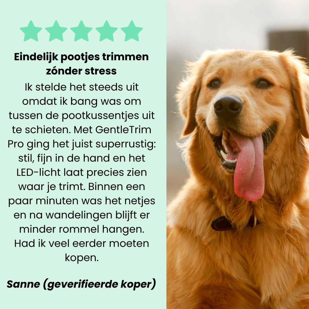 Voor baasjes die pootjes willen verzorgen zonder stress: meer zicht, meer rust en meer controle tussen de pootkussentjes. Geen spannend gedoe met schaar of een trimmer die te grof is voor dat kleine, gevoelige stukje. GentleTrim Pro is gemaakt om dit juist makkelijk te maken: even tussendoor na een wandeling, zonder strijd of twijfel. Zo blijven de pootjes comfortabel, je huis schoner en jij houdt dat fijne gevoel dat het goed geregeld is.