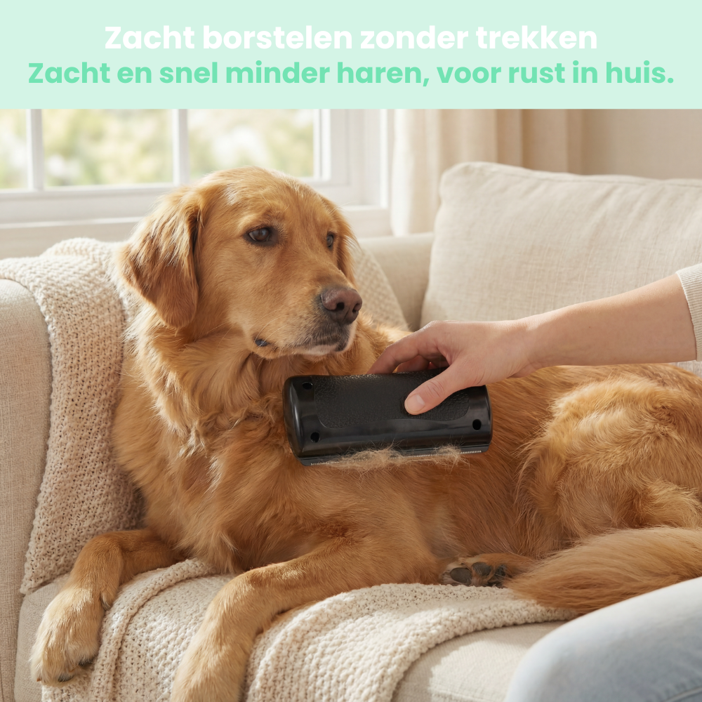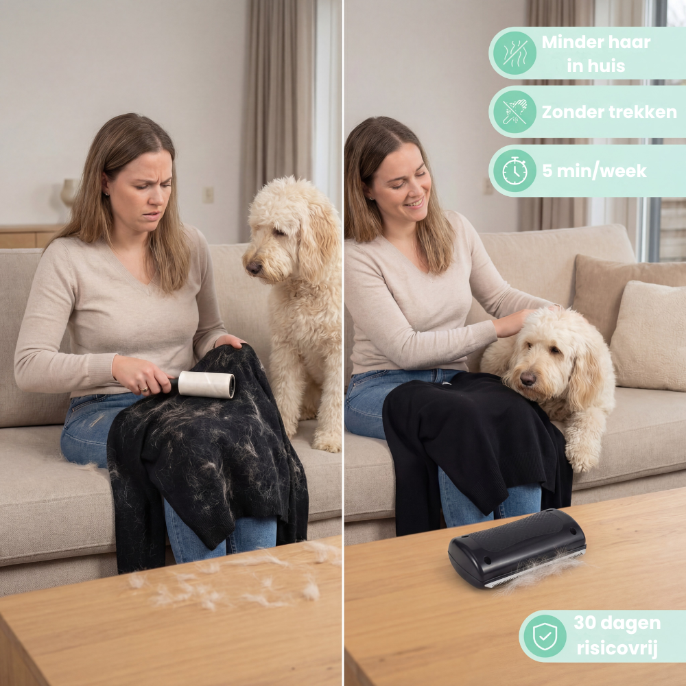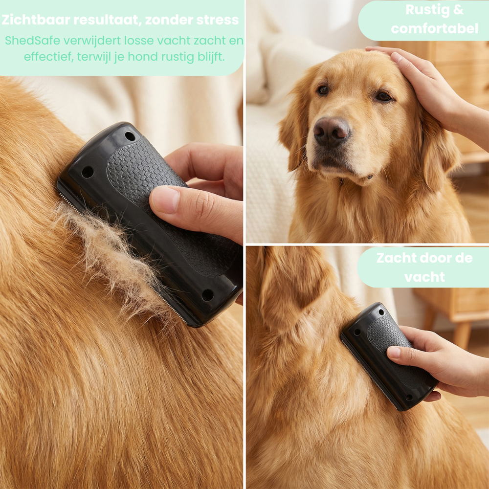 Je komt thuis na een drukke dag, je hond springt enthousiast op de bank en een paar minuten later zie je alweer haren overal. In plaats van weer te gaan stofzuigen, pak je de ShedSafe. Je borstelt rustig met de vacht mee, je dier blijft ontspannen zitten en jij ziet direct hoeveel losse haren je eruit haalt. Daarna is het weer knuffeltijd, met een bank die een stuk netter blijft.
