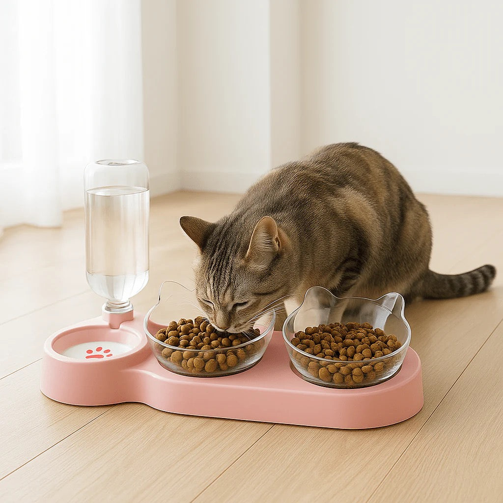 Deze 3-in-1 set combineert twee voerbakken met een slimme waterdispenser. De gekantelde kommetjes verlagen de druk op nek en rug, terwijl de sifonfles het drinkbakje automatisch bijvult. Afneembare onderdelen maken schoonmaken snel en hygiënisch, zodat je huisdier elke dag comfortabel eet en altijd vers water heeft.